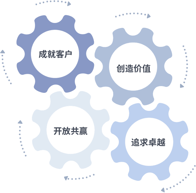 成就客户是一切决策的出发点,,创造价值是衡量所有工作的标准,,,追求卓越是我们做事做人的态度,,,,开放共赢是我们的格局也是最终的结果。。。价值观的齿轮环环相扣,,推动着组织里的每个人不断向前。。。。